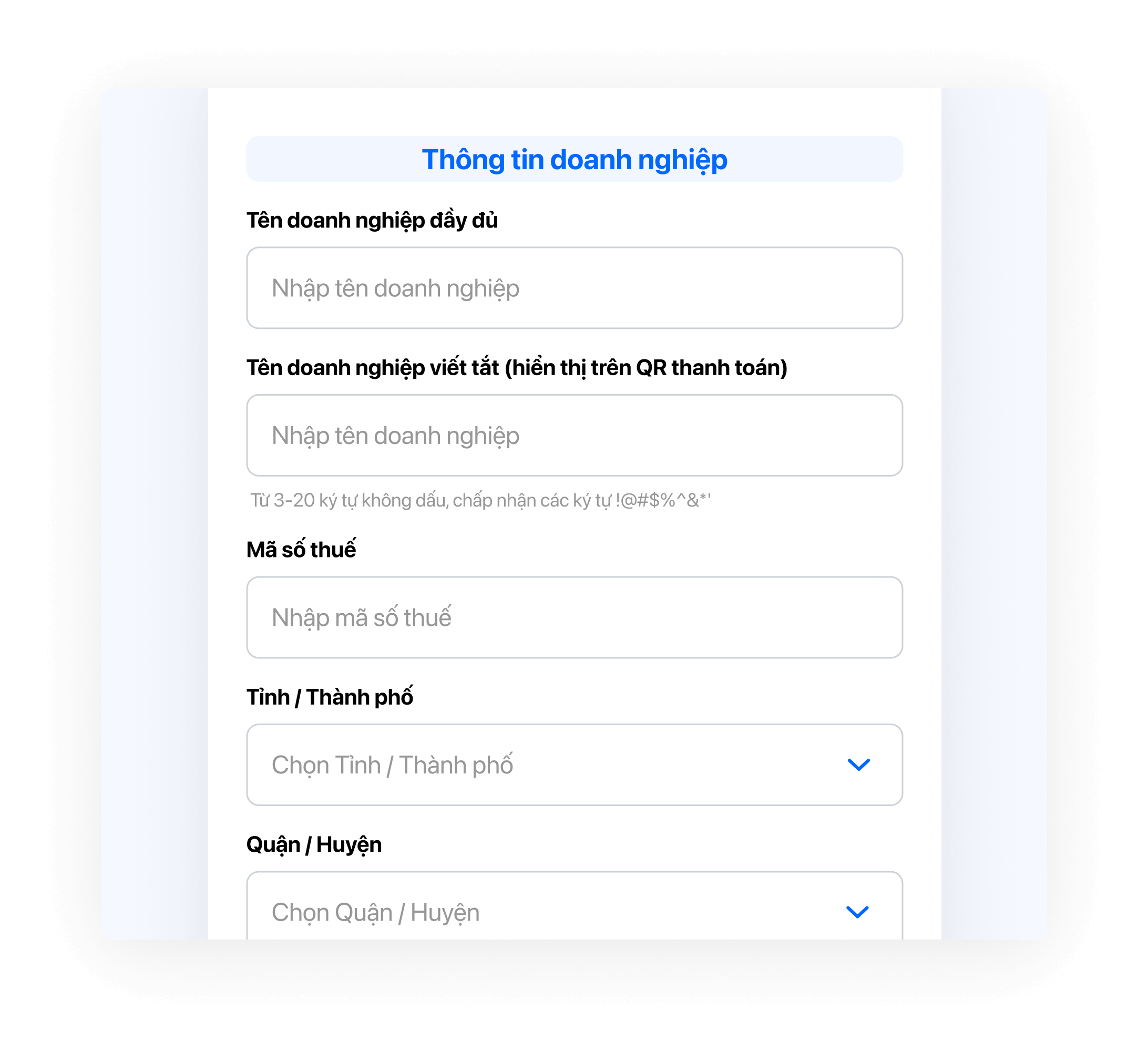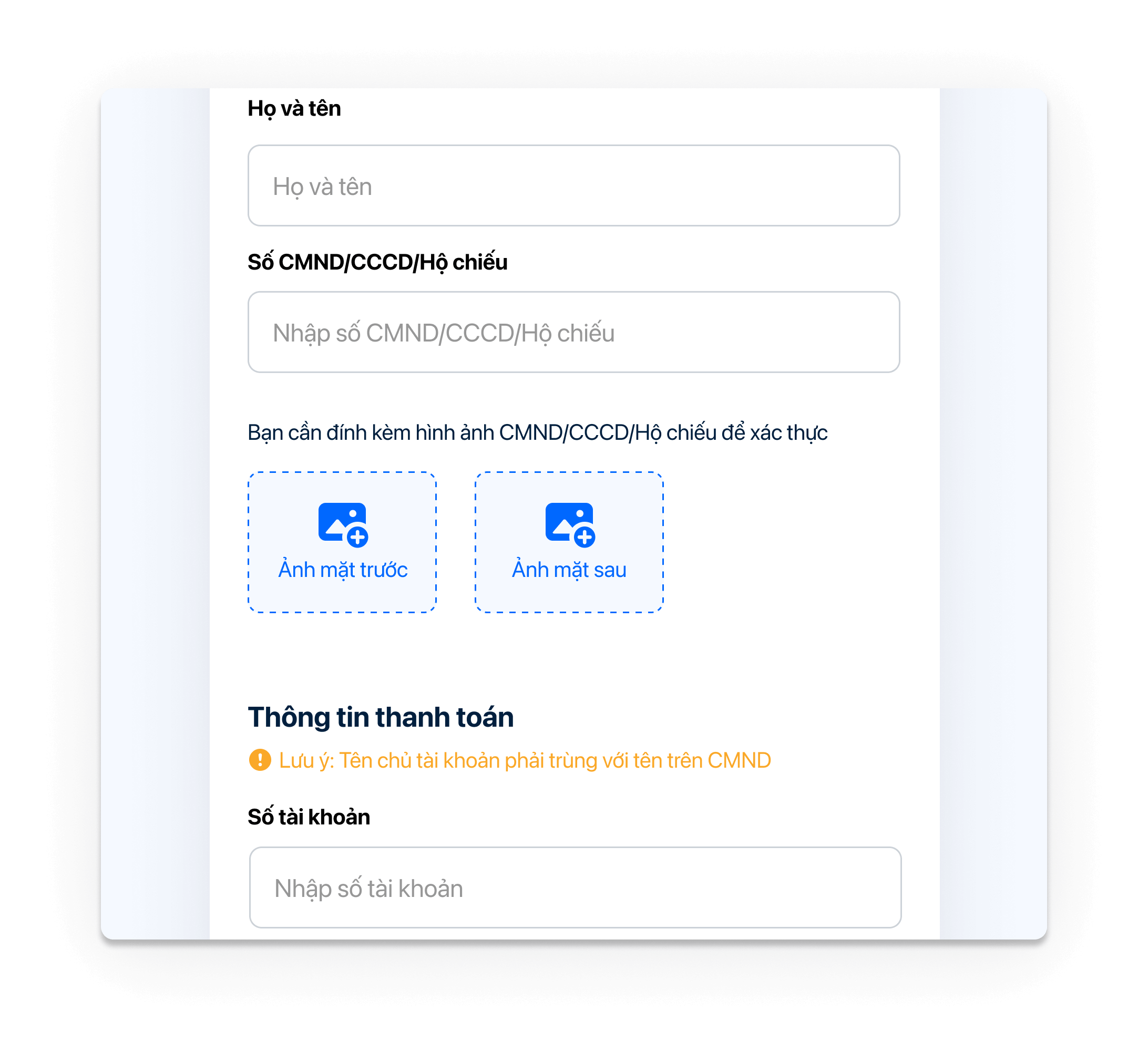 Điền các trường thông tin trong mẫu đăng ký Thông tin kinh doanh bao gồm tài khoản ngân hàng nhận tiền.