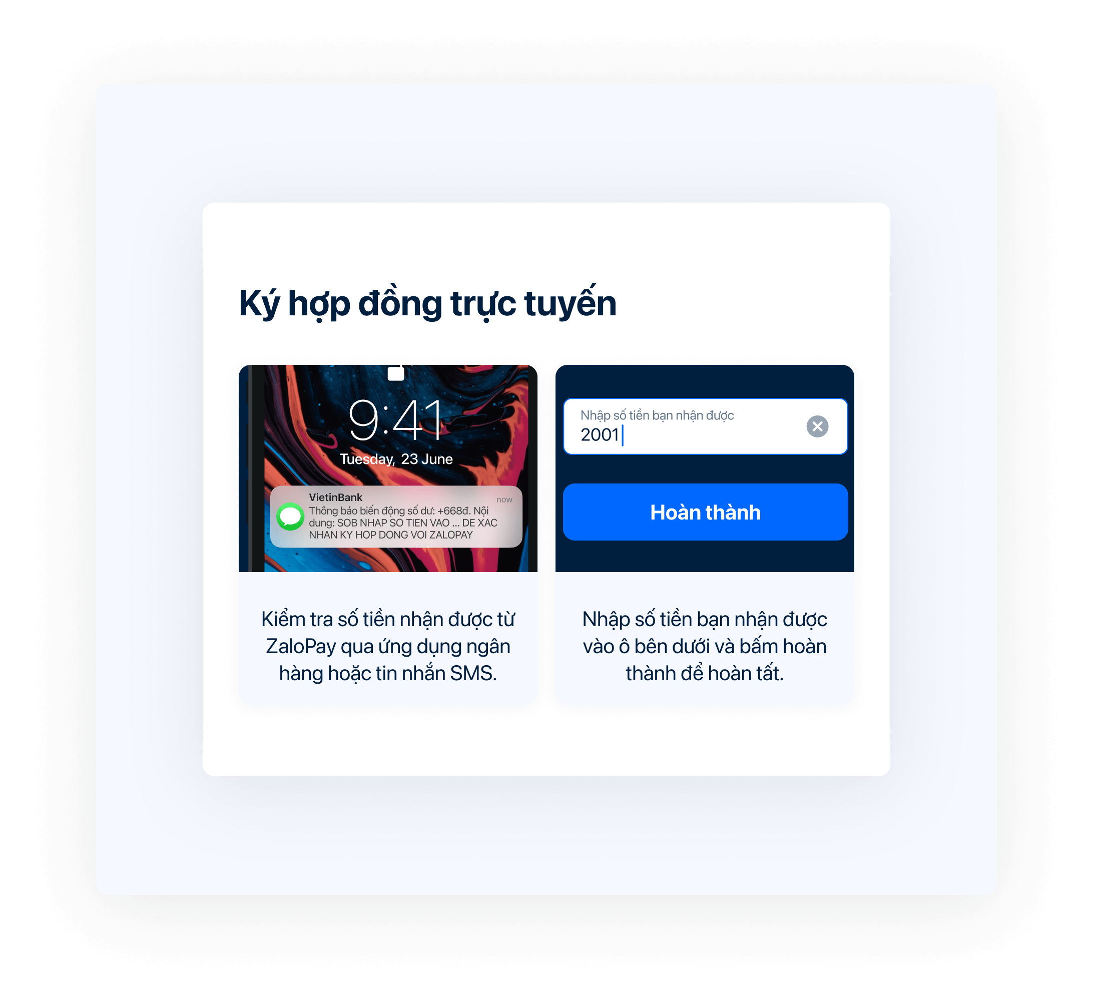 Ký kết hợp đồng trực tuyến bằng cách nhập số tiền Zalopay gửi qua tài khoản ngân hàng đã đăng ký của Đối tác.